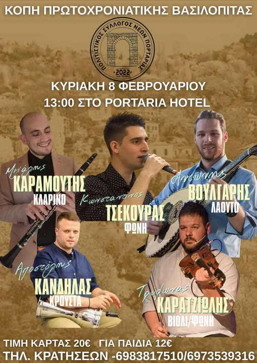 Σας περιμένουμε στην κοπή της πρωτοχρονιάτικης Βασιλόπιτας μας, την Κυριακή 8 Φεβρουαρίου, στο Portaria Hotel μετά την 13:00.
